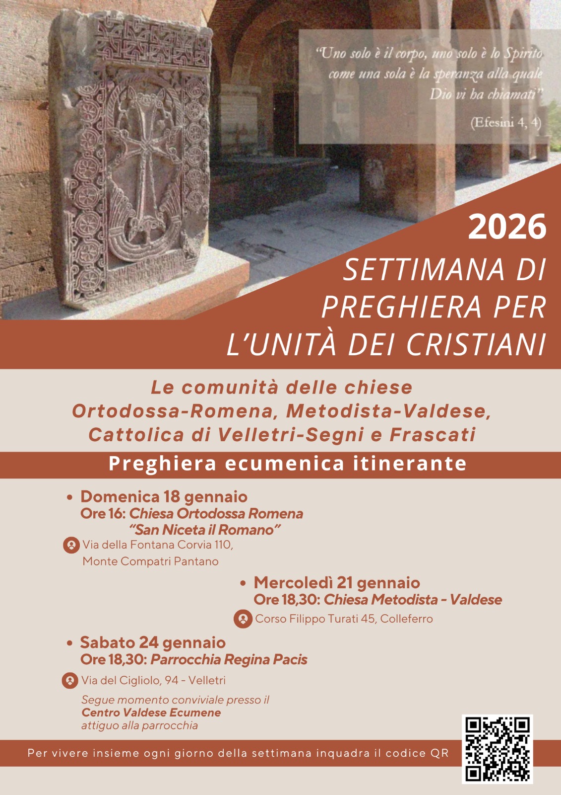 N.B. : inquadrando con il cellulare il QR code in locandina è possibile accedere al sussidio con tutti i testi per la preghiera preparati dal Dicastero per la Promozione dell’Unità dei Cristiani  e la Commissione Fede e Costituzione del Consiglio Ecumenico delle Chiese.