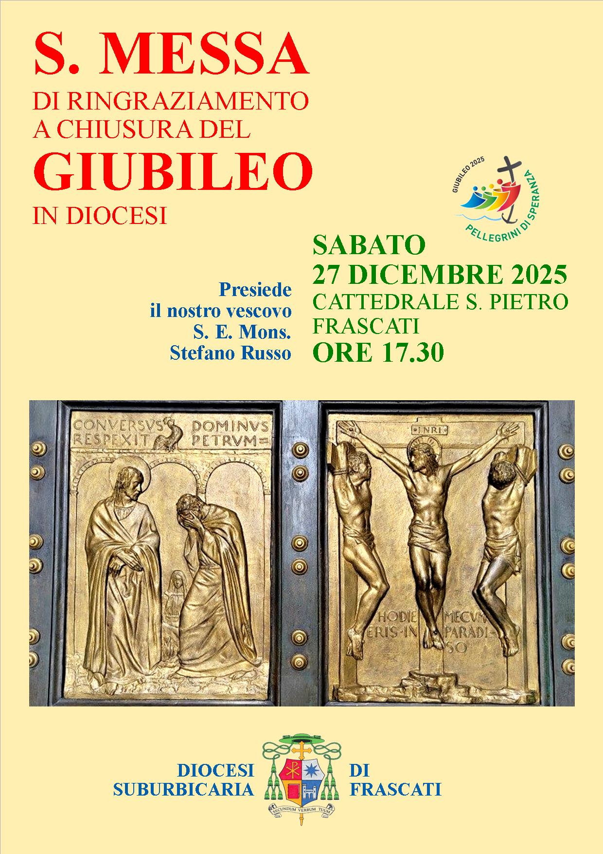 Si terrà sabato 27 dicembre 2025, alle ore 17.30, presso la Cattedrale di San Pietro a Frascati, la Santa Messa di ringraziamento a chiusura del Giubileo in diocesi. L’importante celebrazione rappresenta un momento conclusivo di preghiera e gratitudine per il cammino giubilare vissuto dalla comunità diocesana.